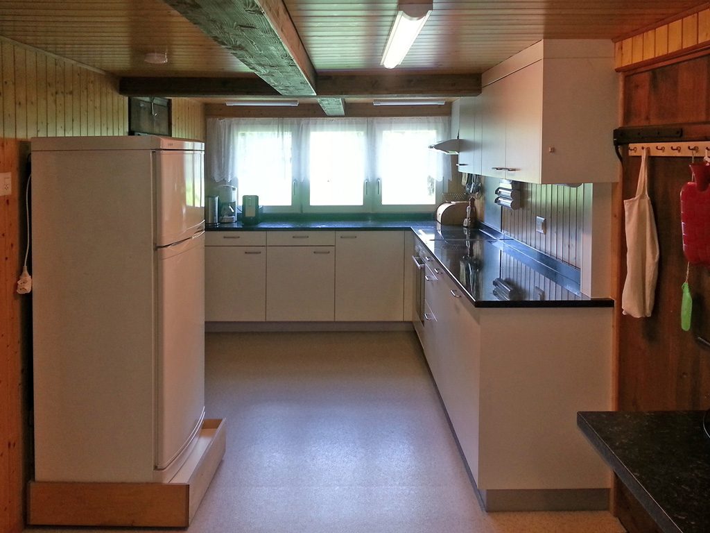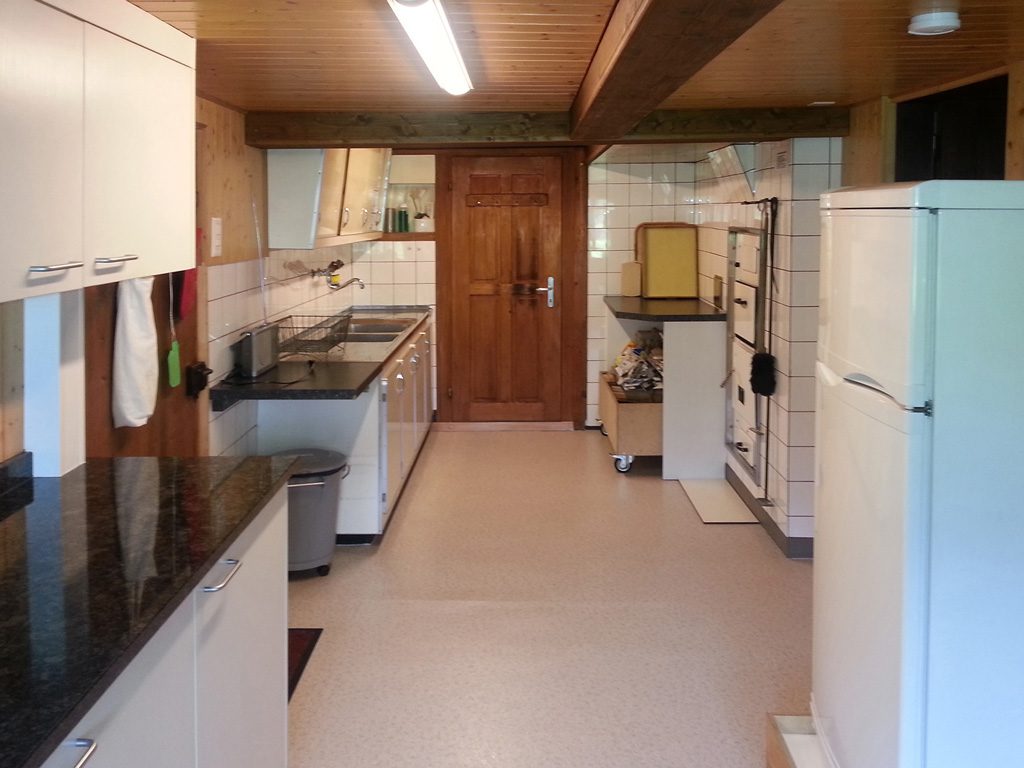Im Erdgeschoss befindet sich eine grosse Stube, die mit einer Falt-Wand unterteilt werden kann. Ein zusätzliches Esszimmer kann für kleinere Gästegruppen benutzt werden. Die grosszügige renovierte Küche ist modern und zweckmässig, jedoch ohne Geschirrspülmaschine ausgerüstet.