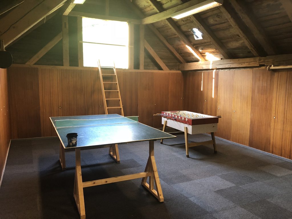 Das Haus ist zweckmässig und einfach eingerichtet. Für Kinder und Erwachsene stehen es diverse Spiele, Bücher und einen Pingpong Tisch zur Verfügung. Beheizt wird das Haus mit einem Kachelofen, die Nasszellen werden separat mit Elektro-Öfen aufgewärmt.